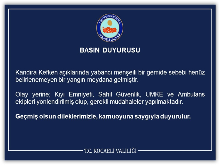Açıklamada, "Kandıra Kefken açıklarında yabancı menşeli bir gemide sebebi henüz belirlenemeyen bir yangın meydana gelmiştir.