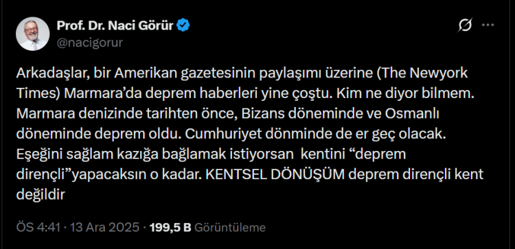 Görür, sosyal medya hesabından "Arkadaşlar, bir Amerikan gazetesinin paylaşımı üzerine (The Newyork Times) Marmara’da deprem haberleri yine coştu. Kim ne diyor bilmem. Marmara denizinde tarihten önce, Bizans döneminde ve Osmanlı döneminde deprem oldu. Cumhuriyet döneminde de er geç olacak. Eşeğini sağlam kazığa bağlamak istiyorsan kentini 'deprem dirençli' yapacaksın o kadar. KENTSEL DÖNÜŞÜM deprem dirençli kent değildir" sözleriyle paylaşım yaptı.
