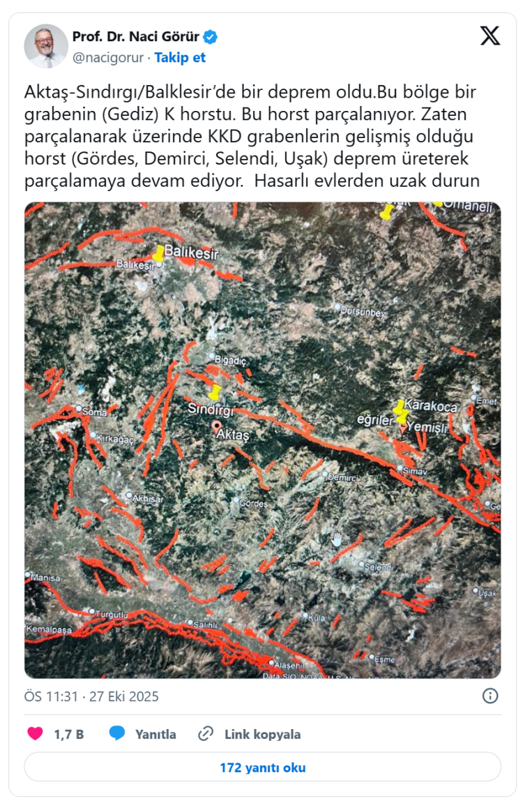 Görür, “Aktaş-Sındırgı/Balıkesir’de bir deprem oldu. Bu bölge bir grabenin (Gediz) kuzey horstu. Bu horst parçalanıyor. Zaten parçalanarak üzerinde KKD grabenlerin gelişmiş olduğu horst (Gördes, Demirci, Selendi, Uşak) deprem üreterek parçalamaya devam ediyor. Hasarlı evlerden uzak durun.” ifadelerini kullandı.