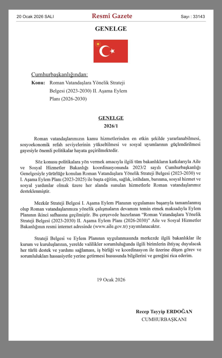 Cumhurbaşkanlığı tarafından yayımlanan genelgeyle, Roman Vatandaşlara Yönelik Strateji Belgesi (2023-2030) II. Aşama Eylem Planı (2026-2030) yürürlüğe girdi. 20 Ocak 2026 tarihli Resmî Gazete’de yayımlanan genelgeyle, Roman vatandaşların kamu hizmetlerinden daha etkin yararlanması ve sosyoekonomik refah seviyelerinin artırılması hedefleniyor.