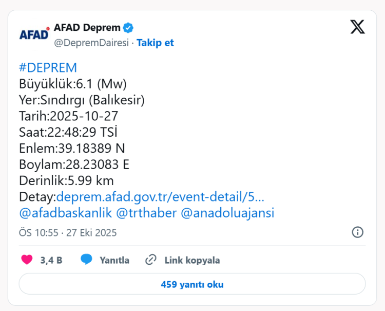 AFAD'dan yapılan açıklamalara göre Balıkesir'in Sındırgı ilçesinde 6.1 büyüklüğünde deprem oldu. Sarsıntı, Bursa, İstanbul, İzmir ve çevre illerden de hissedildi.