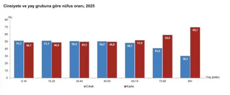 Adrese Dayalı Nüfus Kayıt Sistemi (ADNKS) sonuçlarına göre 31 Aralık 2025 tarihi itibarıyla kadın nüfus 43 milyon 32 bin 734 kişi, erkek nüfus 43 milyon 59 bin 434 kişi oldu. Diğer bir ifadeyle toplam nüfusun yüzde 49,98’ini kadınlar, yüzde 50,02’sini ise erkekler oluşturdu. Kadınlar ile erkekler arasındaki bu oransal denge, kadınların daha uzun yaşaması nedeniyle 60 ve daha yukarı yaş grubundan itibaren kadınların lehine değişti. Kadın nüfusun oranı 60-74 yaş grubunda yüzde 51,9 iken 90 ve üzeri yaş grubunda yüzde 69,7 oldu.
