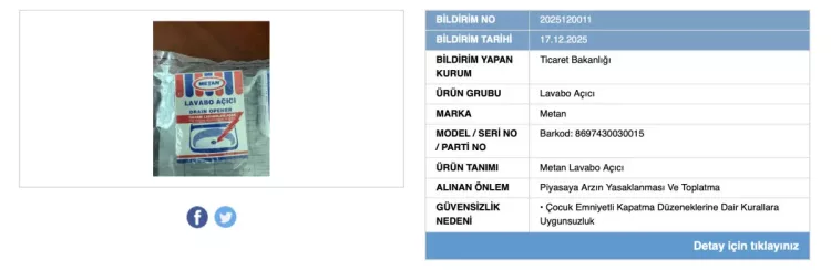 Bakanlık tarafından paylaşılan bilgilere göre Metan marka lavabo açıcıda “Çocuk Emniyetli Kapatma Düzeneklerine Dair Kurallara Uygunsuzluk” tespit edildi.