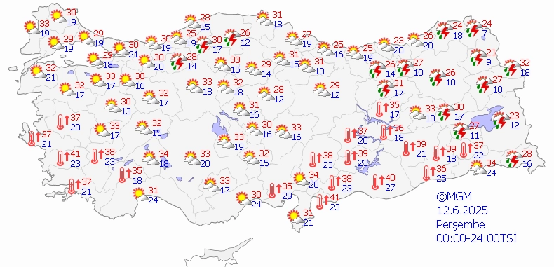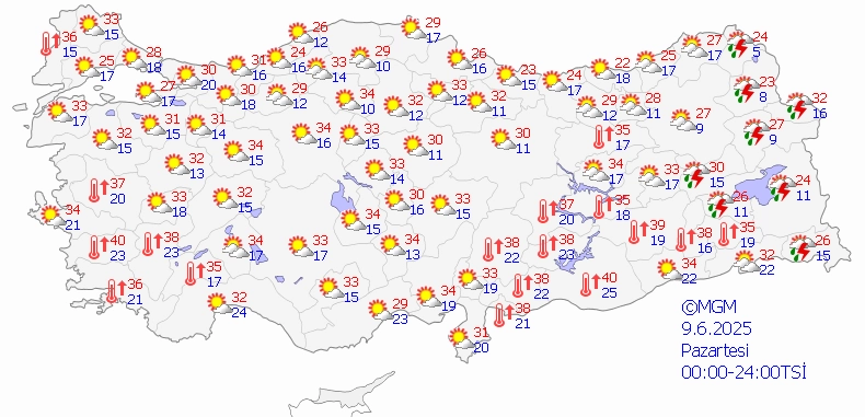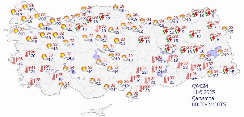 Önümüzdeki beş günlük süreçte günün en yüksek sıcaklık değerlerinin Bursa'da 30, Ankara'da 34, İstanbul'da 29, İzmir'de 37, Antalya'da 35, Adana'da 37, Samsun'da 27, Trabzon'da 23, Diyarbakır'da 41 dereceye kadar yükselmesi bekleniyor.