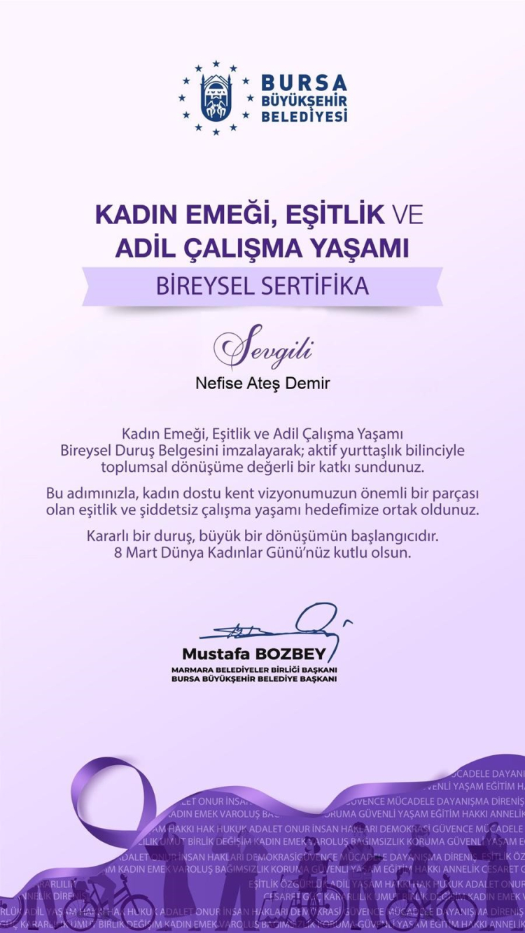 Bursa Büyükşehir Belediyesi, kadın emeğini görünür kılmak ve eşit, şiddetsiz bir çalışma yaşamını desteklemek amacıyla başlattığı ‘Bireysel ve Kurumsal Duruş Belgesi’ hareketiyle Türkiye’ye örnek oluyor.