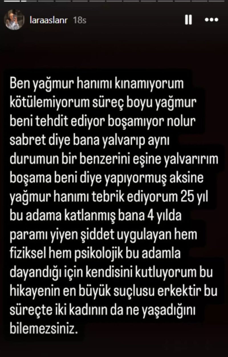 Sabri Sarıoğlu'ndan hamile kaldığını belirten Lara Aslan, "Bana bulaştırdığın hastalığın ceremesini çekerken demediğini bırakmadın. Hamileyken şiddet gördüm. Bu yaşadıklarımın en küçüğü olarak kalmış. Tamı tamına 4 yıl hayatımdan, sağlığımdan çalınan 4 yıl. Bana hâlâ 30 bin dolardan fazla borcu var. Kendi karısına beni kötü olarak, bana da karısını 'kötü hasta' olarak gösteren gerçek bir hastadan bahsediyoruz." dedi.