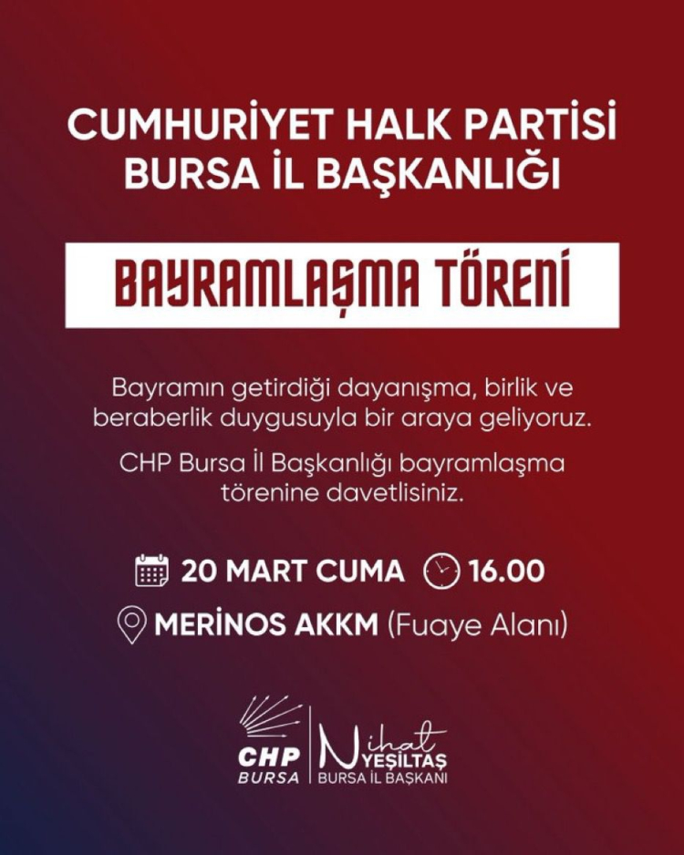 Cumhuriyet Halk Partisi Bursa İl Başkanlığı ise bayramlaşma törenini 20 Mart Cuma günü saat 16.00’da Merinos AKKM Fuaye Alanı’nda düzenleyecek. Program, İl Başkanı Nihat Yeşiltaş ev sahipliğinde yapılacak.