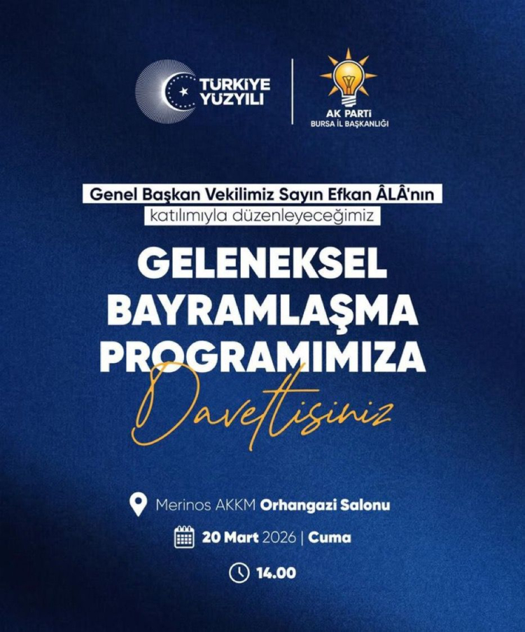 Adalet ve Kalkınma Partisi Bursa İl Başkanlığı’nın geleneksel bayramlaşma programı, Genel Başkan Vekili Efkan Âlâ’nın katılımıyla 20 Mart 2026 Cuma günü saat 14.00’te Merinos AKKM Orhangazi Salonu’nda gerçekleştirilecek.