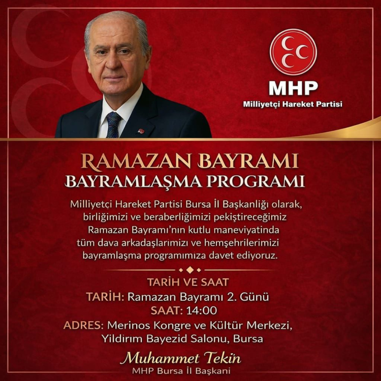 Milliyetçi Hareket Partisi Bursa İl Başkanlığı’nın bayramlaşma programı ise Ramazan Bayramı’nın 2. günü saat 14.00’te Merinos Kongre ve Kültür Merkezi Yıldırım Bayezid Salonu’nda gerçekleştirilecek. Programa İl Başkanı Muhammet Tekin ev sahipliği yapacak.