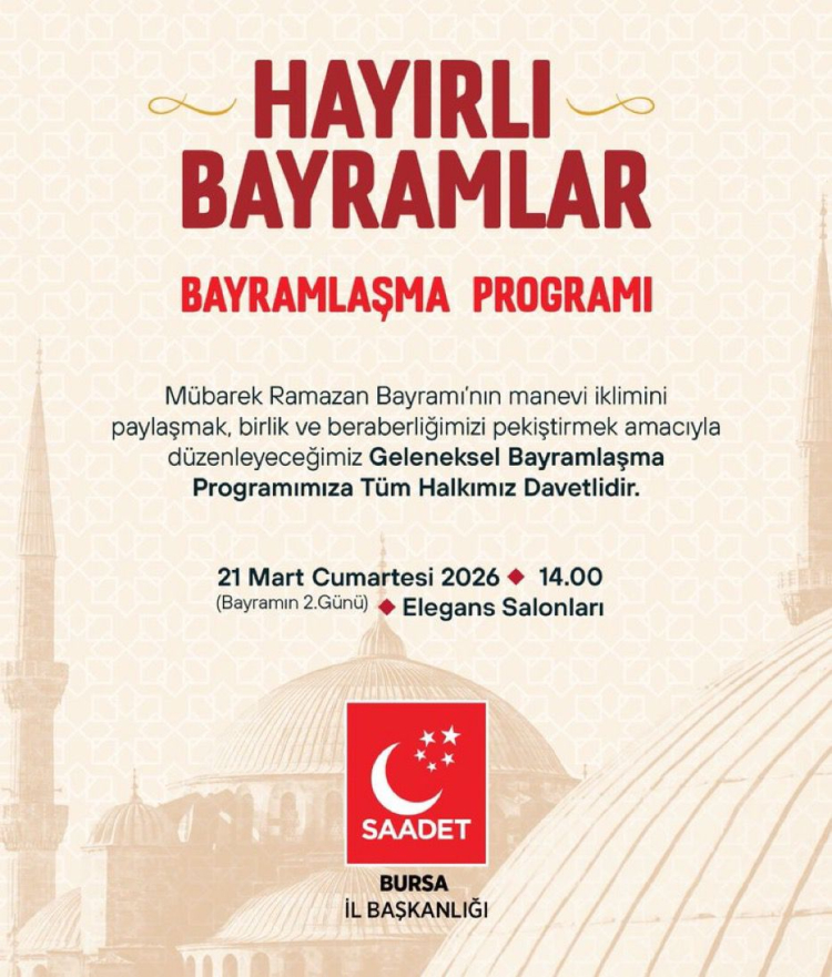Saadet Partisi Bursa İl Başkanlığı, bayramlaşma programını 21 Mart 2026 Cumartesi günü saat 14.00’te Elegans Salonları’nda gerçekleştirecek.