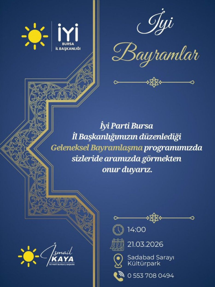 İYİ Parti Bursa İl Başkanlığı’nın geleneksel bayramlaşma programı ise 21 Mart 2026 tarihinde saat 14.00’te Kültürpark Sadabad Sarayı’nda yapılacak. Program, İl Başkanı İsmail Kaya ev sahipliğinde düzenlenecek.