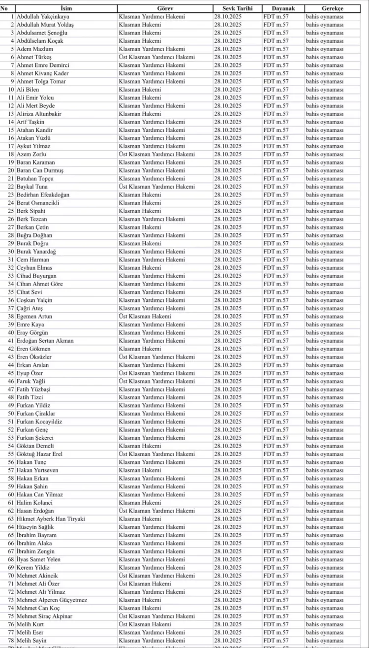 80- Klasman Yardımcı Hakemi MERT ÖZTÜRK’ün futbol müsabakalarına ilişkin “bahis oynaması” nedeniyle Futbol Disiplin Talimatı’nın 57. maddesi uyarınca 28.10.2025 tarihinden itibaren tedbirli olarak PFDK'ya sevkine karar verilmiştir.
